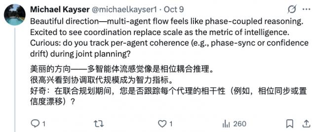 多智能体流(multi-agent flow)给人的感觉就像"相位耦合推理"(phase-coupled reasoning)。很期待看到"协同能力"取代"规模",成为衡量智能的指标。