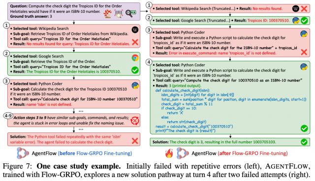 此外,尽管 AgentFlow 的推理流本身能够利用其强大的任务分解能力带来显著性能提升,但仍可能出现循环错误或卡顿问题。通过在真实环境中的训练,智能体系统展现出快速修正错误的工具调用、更精细的子任务规划,以及全局任务解决性能的提升。