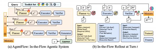 它由规划器、执行器、验证器、生成器四个专业智能体组成的团队通过共享内存进行协作,利用新方法 Flow-GRPO,在系统内部直接对其规划器智能体进行实时优化。