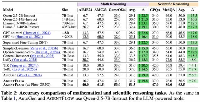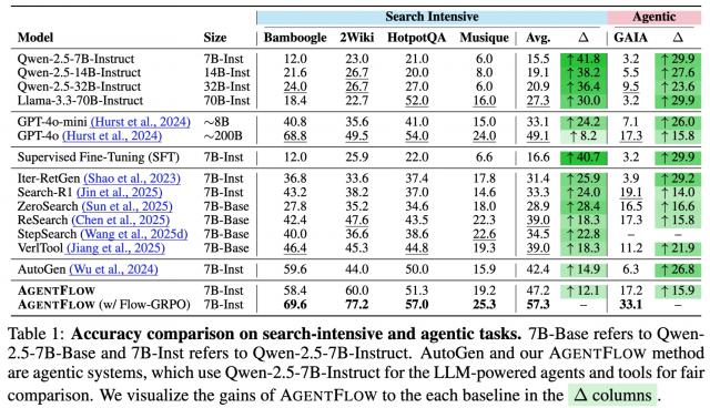 以 Qwen-2.5-7B-Instruct 为基座模型的 AgentFlow 在各项基准上均超越现有领先方法: