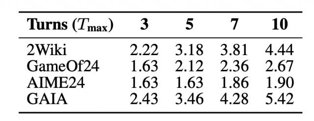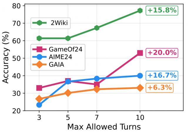 对于相同的数据集下的不同难度任务:譬如说多跳搜索(Multihop Search),智能体任务中的密集长链推理任务,AgentFlow 在经过 FlowGRPO 训练后能够随着最大限制推理步数的上升稳步提升性能,同时又不会大幅提升平均推理步数——这表示对于长难任务会增加有效的推理步数来提升正确率,而不会一味地所有任务都随着最大轮数限制而延长推理步数。
