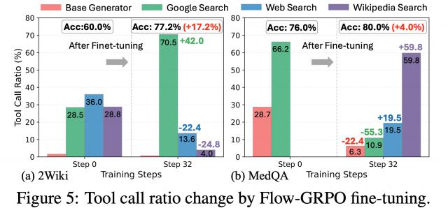 有意思的是,经过 Flow-GRPO 的强化训练规划器,系统学会了根据任务特点选择合适的工具组合;同时,经过训练的系统会自发探索出新的工具使用模式,比如组合使用维基百科搜索(Wikipedia Search)和特定网页增强搜索(Web Search)的连招,通过工具链获得更加深入地信息挖掘,而这些模式几乎没有在未训练的推理流中出现。
