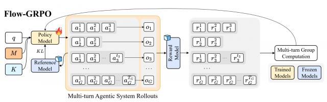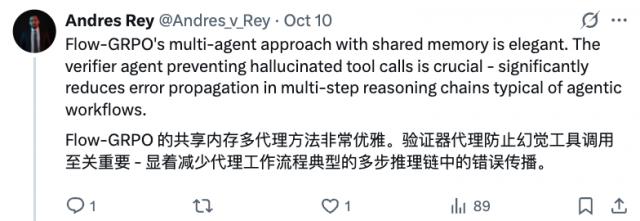 Flow-GRPO 采用共享内存的多智能体架构设计精妙。其中验证智能体对幻觉化工具调用的阻断机制尤为关键——它能显著减少智能体工作流中典型的多步推理链误差传播。