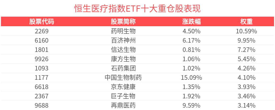 数据显示,截至2025年6月11日,恒生医疗保健指数前十大权重股分别为信达生物、百济神州、药明生物、石药集团、康方生物、中国生物制药、京东健康、三生制药、再鼎医药、翰森制药,前十大权重股合计占比58.22%。
